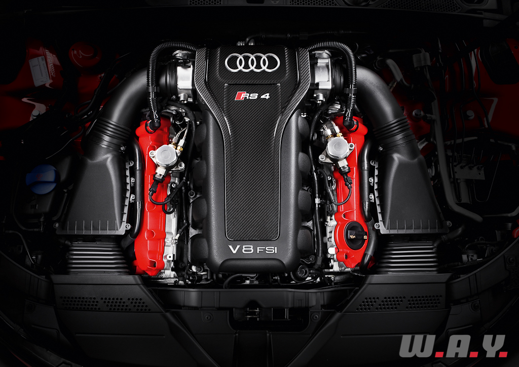 Sous le capot, le V8 atmosphérique du coupé RS5. 4’163 cm3, 450 CV à 8’250 (!) t/min pour un couple maxi de 430 Nm entre 4’000 et 6’000 t/min. D’une puissance spécifique de 108.1 CV/litre, ce propulseur permet à la RS4 Avant d’abattre le 0-100 km/h en 4.7 secondes tandis que la vitesse maxi est bloquée à 250 km/h (280 km/h en option). La consommation moyenne annoncée s’élève à 11 l./100 km.