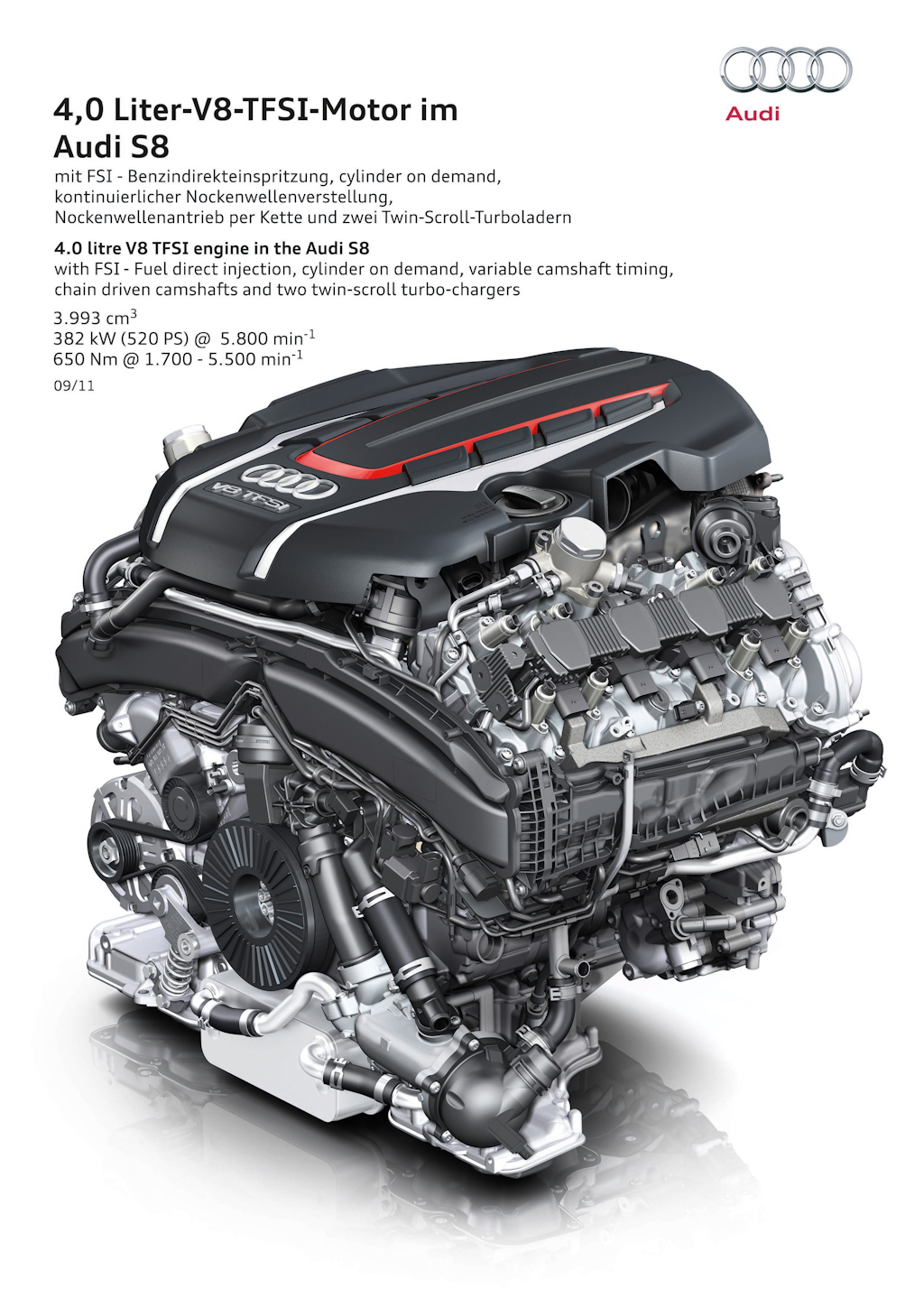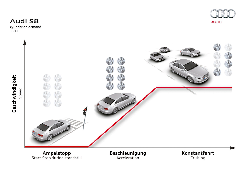 En outre, l’architecture de ce moteur est pour le moins innovante avec la tubulure d’admission à l’extérieur des bancs de cylindres et celle d’échappement, de même que les turbo, engoncés à l’intérieur du “V”. De plus, ce bloc inaugure chez Audi le système de mise en sommeil des cylindres (“cylinder on demand system”). Kesako ? Pour autant que la température du liquide de refroidissement soit de 30°C, que le troisième rapport de boîte (ou plus) soit engagé et que le moteur tourne entre 960 et 3’500 t/min, le système ferme les soupapes d’admission et d’échappement des cylindres 2, 3, 5 et 8. Le V8 devient donc un V4, et permettrait de baisser de plus de 10% la consommation à vitesse stabilisée à 120 km/h. Bien entendu, le système s’enclenche et se déclenche de manière imperceptible, entre 1 et 4 centièmes de secondes en fonction du cycle d’allumage. Enfin, les bruits parasites de l’échappement inhérents à ce système sont anihilés via le ANC (Active Noise Control), tandis que les vibrations sont compensées par des supports moteur électromagnétiques.