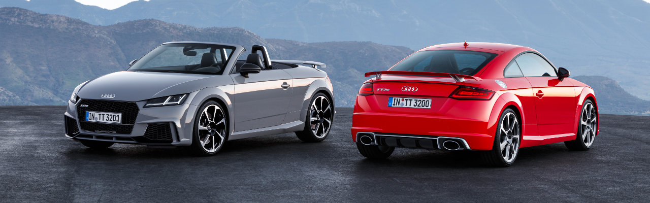 Côté design extérieur, la TT RS se distingue par une large calandre avec grille de radiateur à motif nid d’abeille, portant l’inscription « Quattro » sur le bas du cadre, de grandes entrées d’airs. Sur la face arrière, un spoiler fixe fait son apparition et les sorties d’échappement sont désormais ovales. Cependant, la grande innovation se situe dans les phares arrière, ici OLED (diode électroluminescente organique), une première pour un modèle produit en série.