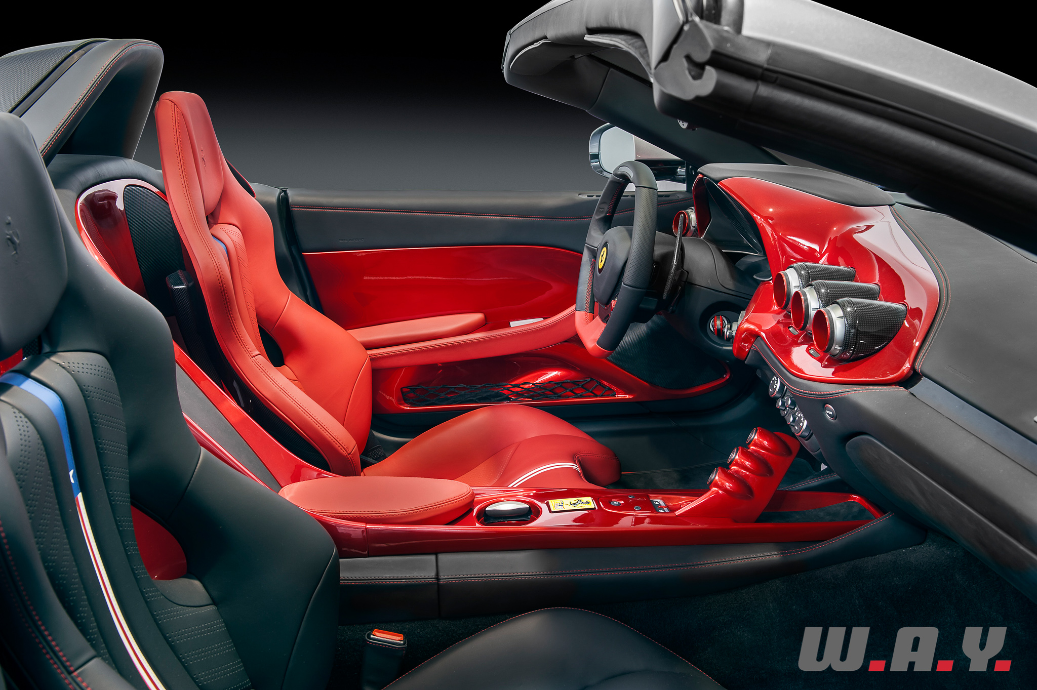 A l’intérieur, le rouge est de mise et les couleurs différenciées pour les deux sièges sont directement reprises des bolides de course des années 60. D’ailleurs, la livrée bleu à bandes blanches rappelle celle des 250 GTO engagées en course par le N.A.R.T. (North American Racing Team).