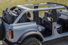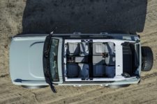 Au niveau du design, chacun aura son avis : dessin néo-rétro trop insipide pour les uns ou effet génial « retour vers le futur » pour les autres, une chose est certaine : il ne laissera pas indifférent. Et en plus d’avoir une gueule, le Bronco se veut résolument utile : 30 cm de garde au sol, un angle de rupture de 29 degrés ainsi qu’un angle de départ de 37,2 degrés, à quoi on peut ajouter un passage à gué de 85 cm. Clairement, il n’est pas là pour trier les lentilles. Il est à noter que le toit sera amovible, tous comme les portes, ces fonctions étant cependant en option. En plus des déclinaisons normales en 2 portes et, pour la première fois, 4 portes, ce Bronco sera aussi proposé avec un équipement pointu pour la conduite tout-terrain sous le patronyme Bronco Sport.