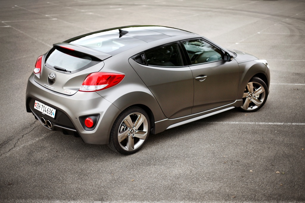 La Hyundai Veloster est un coupé quatre places au lignes très originales. Break de chasse sous certains angles, ce “hatchback” est affublé d’une troisième porte seulement du côté passager. Avec son toit allongé se terminant par un hayon largement vitré, il n’y a pas à dire, le Veloster se démarque clairement dans un paysage automobile plutôt discret dans son ensemble. La marque coréenne ose proposer un véhicule différent et en l’équipant maintenant d’une motorisation Turbo, il confirme cette image quelque peu provocante. Niveau look, l’ensemble est similaire au Veloster normal avec toutefois des dimensions extérieures légèrement agrandies : 30 mm de plus en longueur et 15 mm en largeur. Le Veloster Turbo mesure donc 4,250 mètres de long et 1,805 mètre de large pour une hauteur de 1,399 m et un empattement de 2,650 m. A l’instar des coupés 2+2 de la marque, comme la dernière Genesis, le Veloster propose quatre vraies places dont l’accès est facilité par la seule porte arrière disponible du côté passager. Le volume du coffre est plutôt intéressant avec 320 litres, extensibles à 1’015 litres une fois la banquette arrière rabattue.