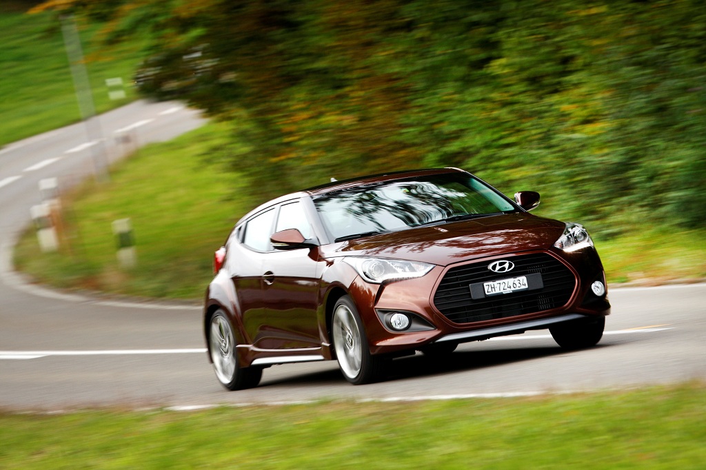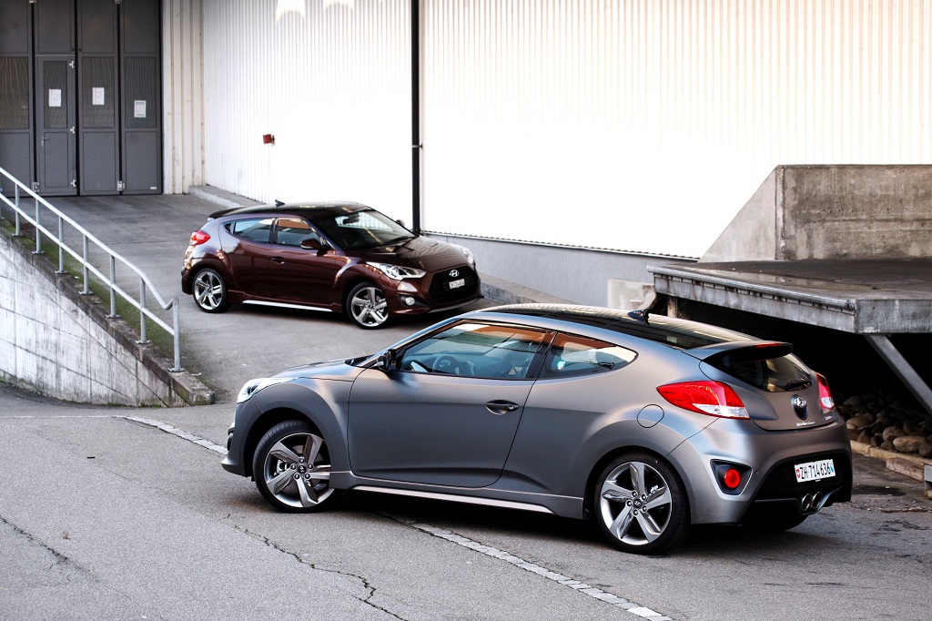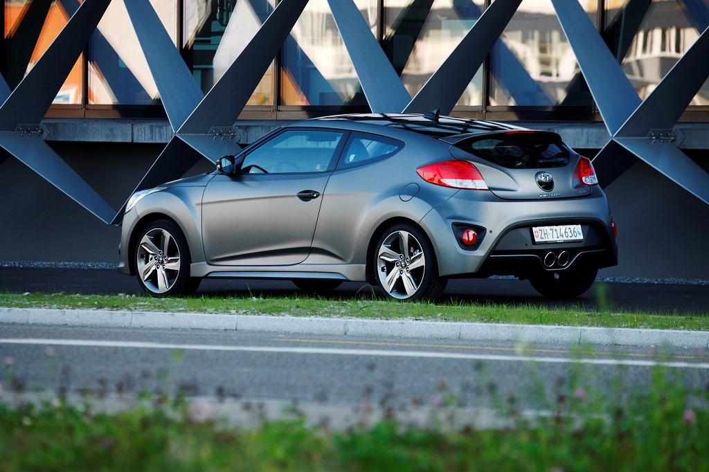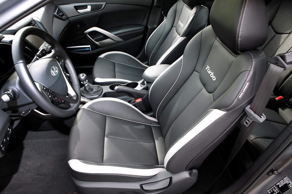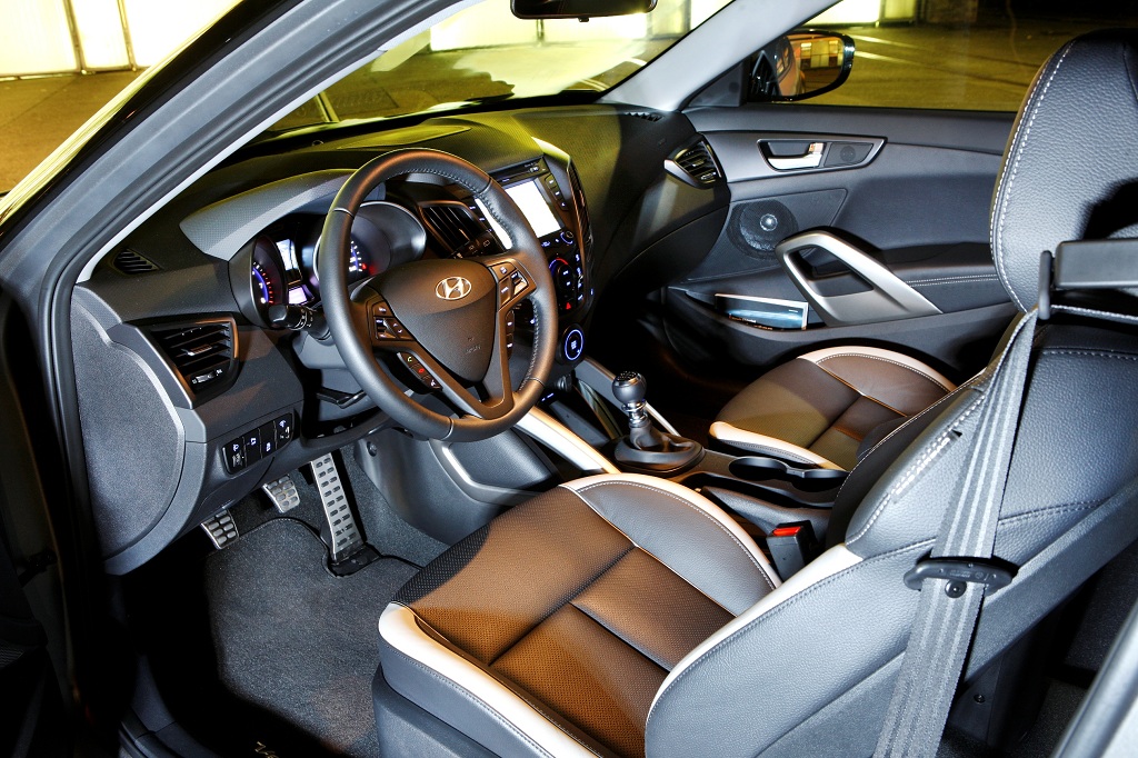 La moteur 1.6 GDI développe 186 CV à 5’500 t/min pour un couple de 265 Nm disponible à partir de 1’500 t/min et jusqu’à 4’500 t/min, grâce à son turbocompresseur à deux étages Twin-Scroll et aux modifications, par rapport à la version atmosphérique, de la distribution variable des soupapes. Toutefois le constructeur nous promet une consommation moyenne plutôt raisonnable de 6.9 l/100km pour des émissions de CO2 de 157 g/km (boîte manuelle). Le tarage sportif du train de roulement et des freins plus grands assurent un comportement routier à la hauteur des performances alors que la modification de l’échappement ravira les amateurs des vocalises mécaniques, une évidence sur un modèle à vocation sportive. Le Veloster Turbo dispose en série d’une boîte manuelle à six rapports ainsi qu’en option, d’une transmission automatique, 6 vitesses également, avec palettes au volant.