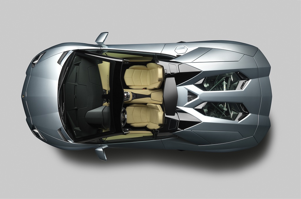 Le design du Roadster est très proche de celui du coupé avec toutefois une ligne encore plus profilée et agressive, encore un peu plus proche de la très exclusive Reventon. Le toit rétractable est composé de deux pièces en fibre de carbone, alliant légèreté et rigidité. Le premier atout n’est par ailleurs pas négligeable du fait que les deux parties se démontent à la main et viennent ensuite prendre place dans le coffre avant de la voiture. La partie arrière a été légèrement revue pour permettre le support du toit amovible, accueillir un système de protection automatique des occupants, améliorer la ventilation du compartiment moteur et surtout offrir la possibilité d’admirer, au travers de deux petites vitres, l’imposant V12 qui anime cette Aventador Roadster. Ce dernier, d’une cylindrée de 6.5 litres développe 700 CV et annonce le 0-100 km/h en seulement 3 secondes ainsi qu’une vitesse maximum de 350 km/h.