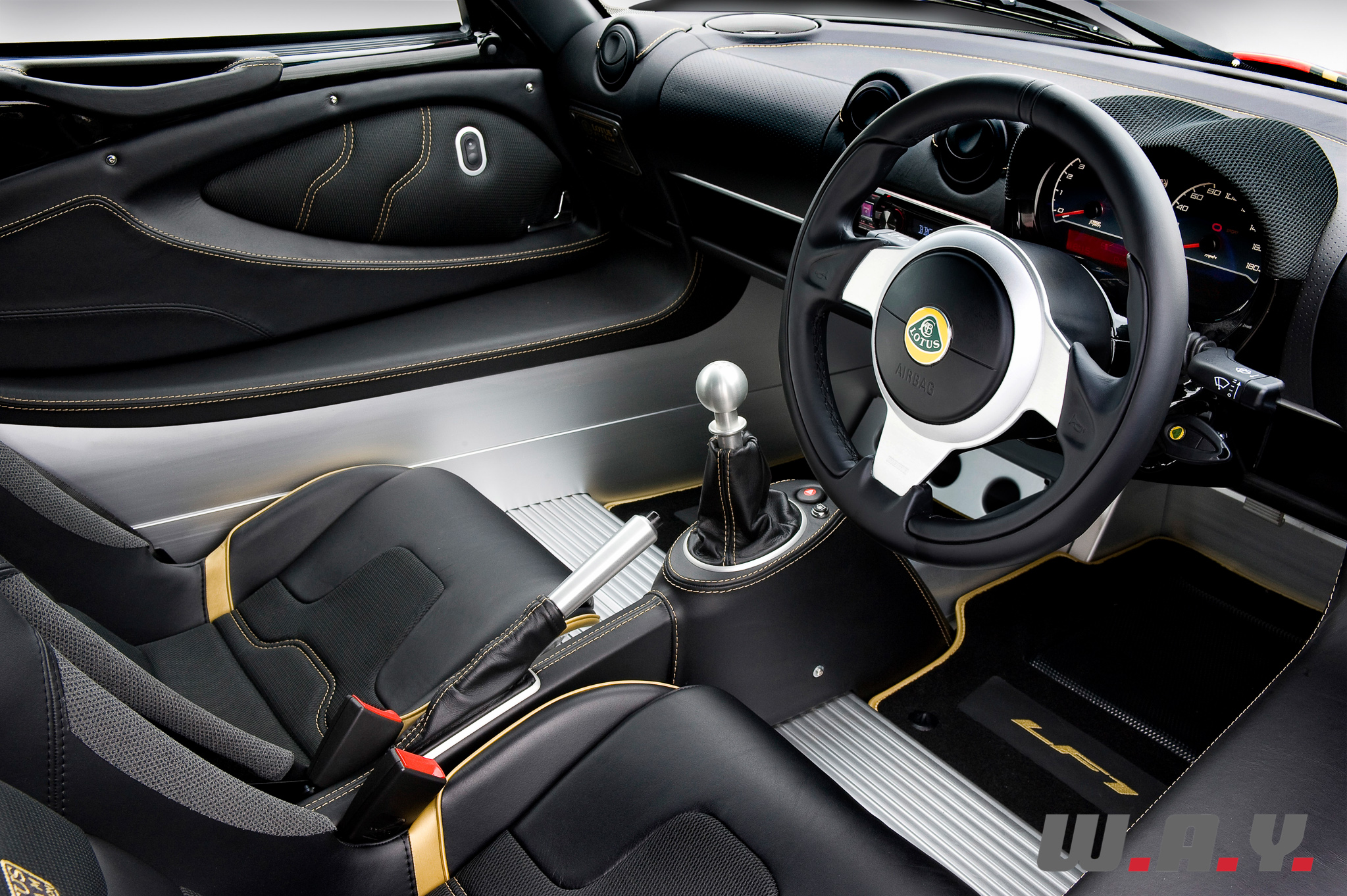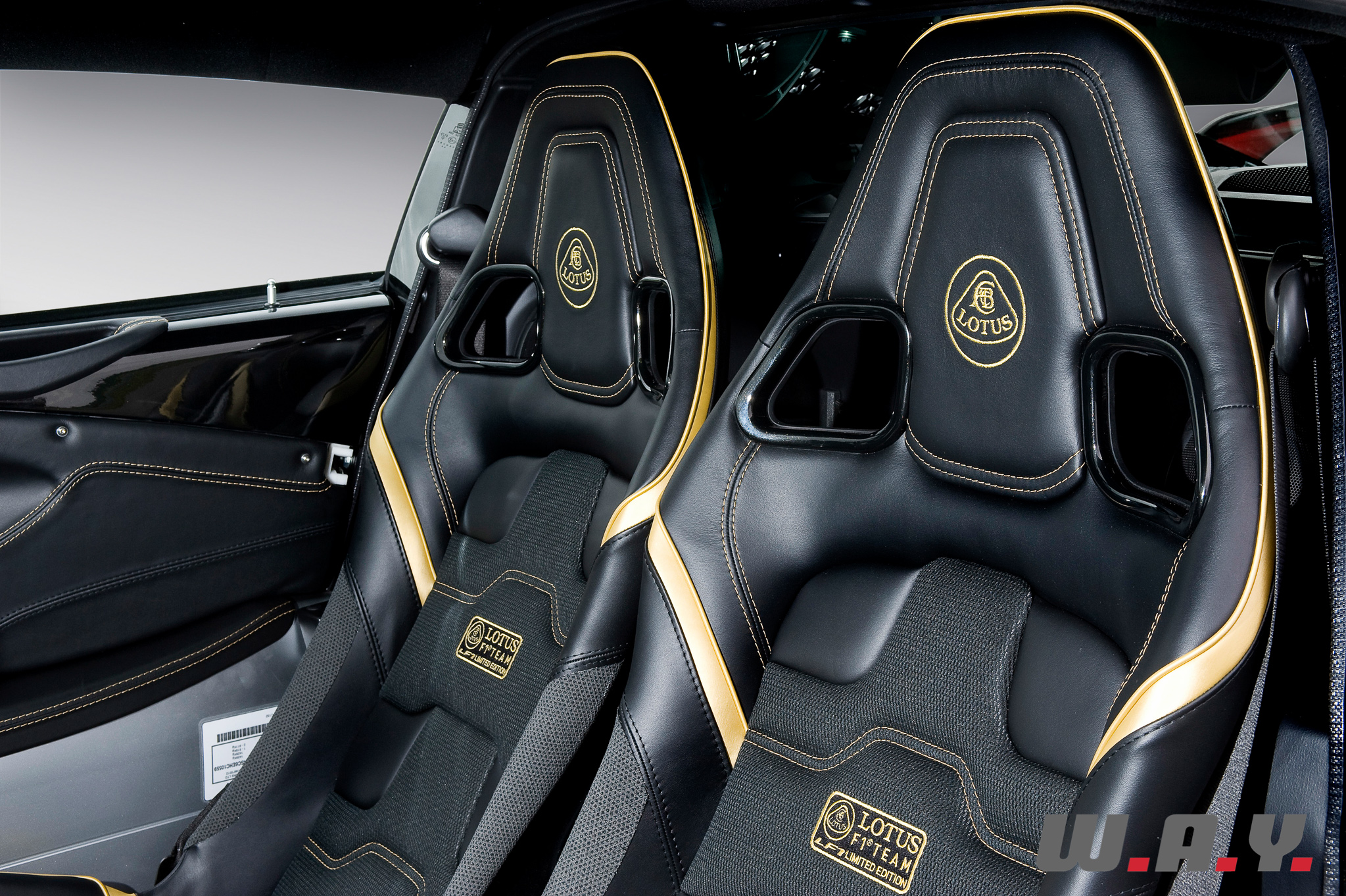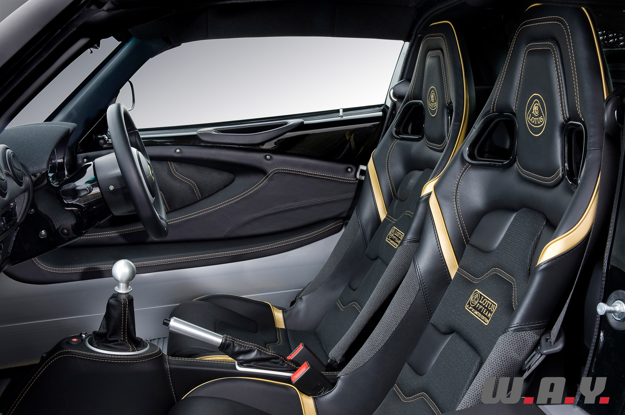 Tous les exemplaires seront livrés en noir et or, couleurs des F1 Lotus actuelles, inspirées par les fameuses Formule 1 Lotus alors sponsorisées par le cigarettier John Player Special dans les années 70. Un rappel des couleurs extérieures est également fait avec le choix de la sellerie intérieure.
