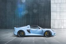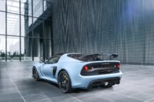 Dans la continuité du style Lotus du moment, la calandre et les entrées d’air à l’avant s’agrandissent, les projecteurs s’affinent. L’arrière est largement marqué par le massif aileron, par les proéminents diffuseurs encadrant la sortie centrale d’échappement. L’ensemble de la carrosserie a naturellement été conçu avec comme objectif la légèreté maximum, principe fondateur de la marque. Le résultat est pour ce modèle remarquable : 1’054 kg dans la configuration la plus favorable. Il est à noter que l’Exige Sport 410 est disponible en version Coupé ou Roadster.