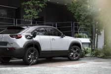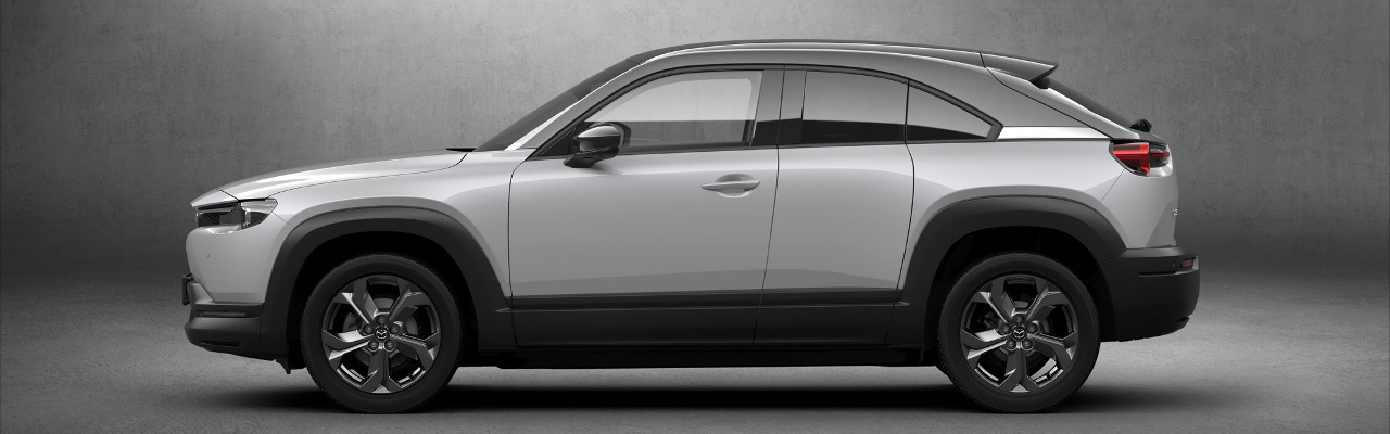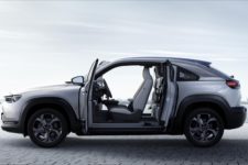 MX : la marque des véhicules d’avant-garde pour le constructeur japonais. Un préfixe qui va naturellement bien pour ce modèle. En plus de passer un cap en matière de motricité, le MX-30 se distingue par l’intégration de portes « freestyle », soit conventionnelles à l’avant mais en « suicide » à l’arrière, une disposition largement répandue sur les concept-cars, beaucoup moins sur les véhicules de série.