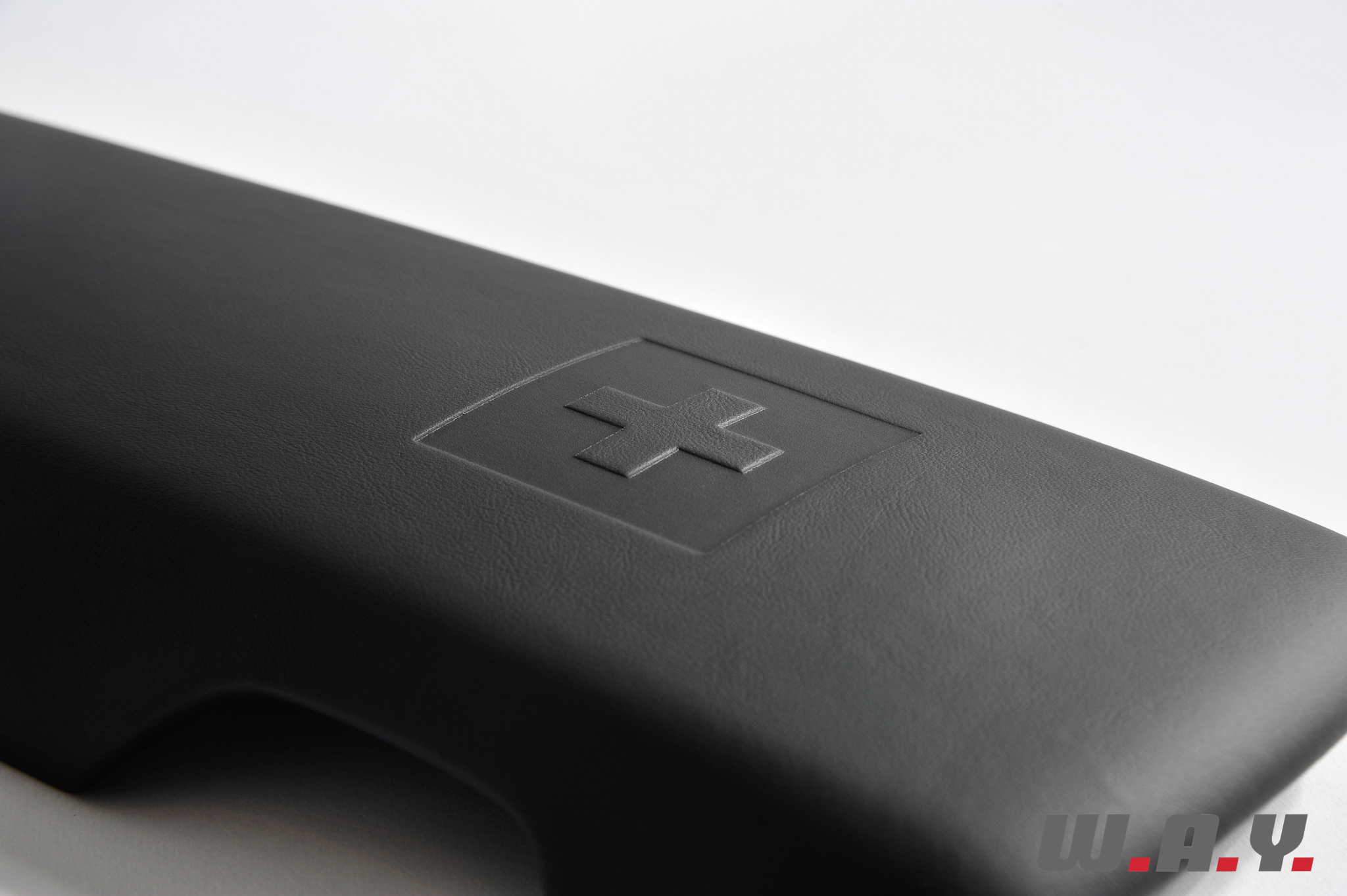 L’habillage est unique, une teinte classique gris-noir qui couvre également les prises d’air ainsi que les jantes “Sport Classic” de 20 pouces. A l’intérieur, le cuir se pare de noir, surpiqué de rouge. Signes distinctifs de cette édition limitée, les seuls de portes en métal brossé flanqués de la croix suisse, la plaquette sur le tableau de bord ainsi que notre drapeau gauffré sur l’accoudoir central.