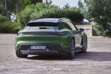 La marque vient donc de sortir la version break du Taycan sous les dénominations suivantes: Taycan 4 Cross Turismo, Taycan 4S Cross Turismo, Taycan Turbo Cross Turismo et enfin, Taycan Turbo S Cross Turismo. Plus qu’une simple déclinaison “combi”, cette version aborde un style baroudeur, en particulier avec le pack Offroad Design rehaussé de 30mm et doté d’ailettes spéciales aux coins des pare-chocs avant et arrière et aux extrémités des seuils de porte.