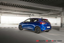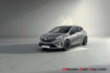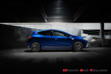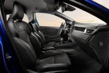 Reste la finition Esprit Alpine qui vient signer la Clio haut de gamme avec des coques de rétroviseurs et l’aileron de requin en Gris Schiste Mat ou Noir Étoilé pour contraster avec la couleur de carrosserie choisie. Le gris se retrouve aussi sur les lames avant et dans des détails d’aile ou de pare-chocs. Les jantes 17″ diamantées noires avec un vernis fumé, elles se reconnaissent à leur design qui rappelle celui des Alpine mais surtout ces faux écrous centraux bleus ou gris pour incarner la sportivité. Les sièges de cette finition sont également spécifiques, plus enveloppants, conçus dans d’autres matériaux durables et arborant différentes textures et surtout un “A” thermosoudée dans le dossier. Un peu partout des surpiqures bleu-blanc-rouge évoque l’origine de la voiture.