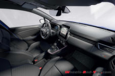 Pour l’habitacle, le nouveau cheval de bataille du constructeur français ce sont les matériaux biosourcés et recyclés. Fini le cuir dans cette nouvelle Clio, c’est du synthétique et des tissus techniques visuellement flatteurs. À partir de la finition Techno, c’est un matériau constitué à 60% de fibre à base de cellulose de bois baptisé TENCEL qui recouvre sièges, panneaux de portes et tableau de bord. C’est la première voiture à intégrer ce tissu à cette échelle. Le tableau de bord passe à l’écran pour toutes les finitions, allant de 7″ à 10″ selon les déclinaisons. Même chose pour l’écran central, de 9.3″ si on opte pour la navigation intégrée, autrement ce sera 7″ aussi. Un ensemble de 20 aides à la conduites peuvent être intégrées à cette Clio 5 phase 2. La plus avancée conjugue le régulateur de vitesse actif permettant l’arrêt et le redémarrage avec le centrage dans la voie pour une délégation de conduite de niveau 2.