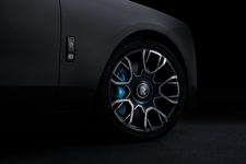 Le modèle Black Badge se distingue en premier lieu avec sa teinte de carrosserie noir profond, le plus noir des noirs fabriqués par Rolls-Royce. Ce ne sont pas moins de 45 kg de peinture qui sont appliqués sur la carrosserie, par thermolaquage. Pour renforcer le caractère sombre du modèle, le « Spirit of Ecstasy » ainsi que l’iconique calandre Pantheon reçoive un traitement noir. Les jantes n’échappent pas à la règle, en combinant alliage léger pour les branches et fibre de carbone pour le châssis de roue.