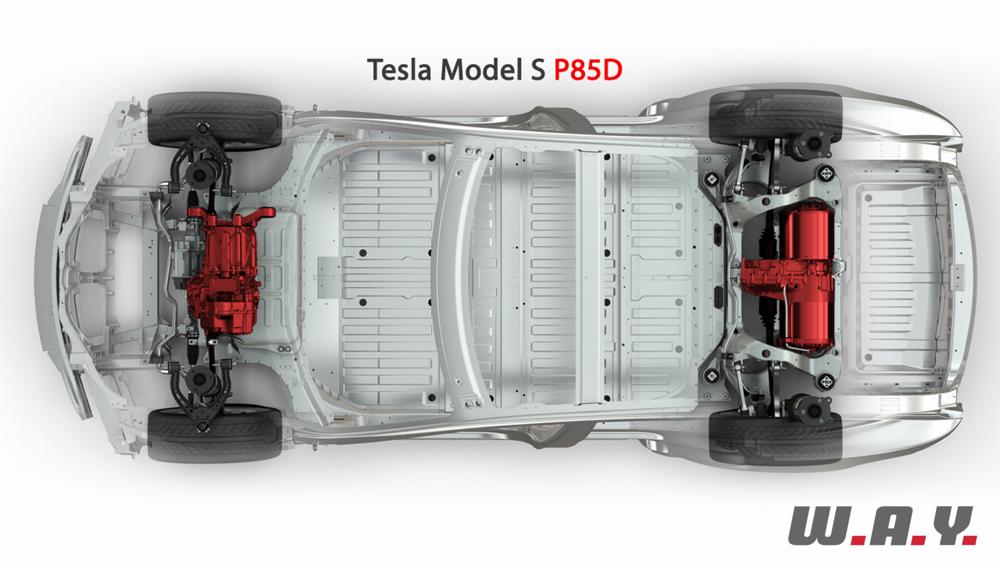 Pour faire simple, Tesla ajoute un moteur électrique de 140 à 165 kW (190 à 224 CV) suivant la version, sur le train avant de sa Model S. En résulte bien évidemment un surcroît de couple mais aussi un meilleur équilibre dynamique. La puissance globale n’est augmentée que sur la P85D, qui totalise pas moins de 700 CV au total ! Comme il n’y a pas de liaison mécanique entre les essieux avant et arrière, le couple délivré aux roues est géré électroniquement entre les deux axes.