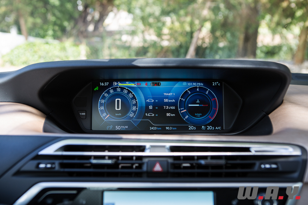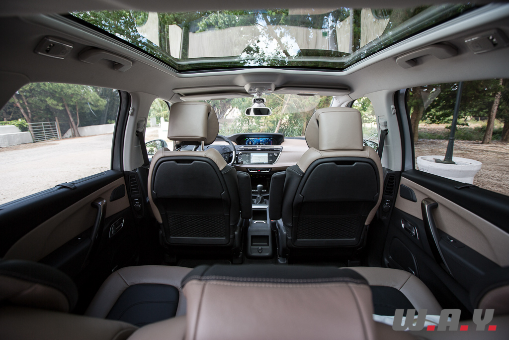 Malgré une pédale d’embrayage un peu haute à mon goût, je m’élance tranquillement sur une autoroute pour engranger des kilomètres et les premiers éléments ressentis sont positifs. Pour commencer, une large vision à 360 degrés me permet de repérer facilement mon environnement immédiat. Le silence à bord est bon même si à bas régimes, je trouve ce moteur à essence un peu bruyant. Le confort est appréciable et enfin, l’accès à l’ensemble de l’instrumentation est bon. Le temps de synchroniser mon iPhone via Bluetooth ou la prise USB (deux éléments en standard sur tous les modèles) et nous voilà partis à la découverte de ce « Technospace » sur les routes… à ce stade, je conseille fortement la sonorisation signée JBL car celle en standard fait peine à entendre.