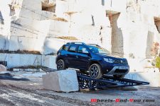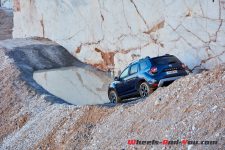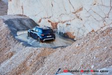 Pour nous montrer qu’un Duster 4×4 n’a pas à rougir d’une vraie utilisation terrain, la marque a choisi d’installer un parcours complet dans la spectaculaire carrière de marbre de Dyonisos. Au milieu des blocs pesant plusieurs tonnes et des véhicules en plein travaux, le petit SUV se fraye un chemin sur plusieurs croisements de ponts, une bascule ou d’impressionnants dévers affichant jusqu’à 28° d’inclinaison au tableau de bord. D’abruptes descentes sont empruntées au point mort et sans toucher les pédales pour laisser travailler le régulateur de vitesse en descente. Surprenant !