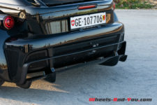 Si l’avant paraît relativement fin, c’est totalement l’inverse pour l’arrière. C’est large, avec des grosses ailes et un nouveau double diffuseur, ainsi que quatre petits phares ronds, le tout accentuant encore un peu plus cette sensation.
