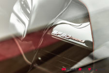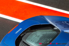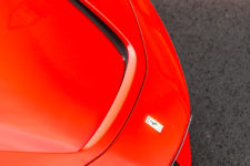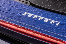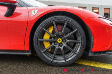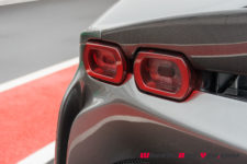 L’avant de la SF90 est acéré, avec un bouclier plongeant sur le bitume et des phares au regard aiguisé. Les différentes entrées d’air et le dessin affuté de ce museau lui confère un dynamisme évident, ainsi qu’une allure très athlétique. L’effet est accentué avec une taille de guêpe et un habitacle compact qui se rapproche véritablement d’un cockpit, de surcroit placé très en avant et très bas pour contribuer à l’abaissement du centre gravité. La partie arrière est plus imposante et sculptée à l’image d’un sportif de haut niveau. Sur la totalité de la carrosserie, on trouve une multitude d’éléments pour optimiser l’aérodynamisme, qui affirment la bestialité de l’engin autant que la double sortie d’échappement placée au milieu de sa poupe.