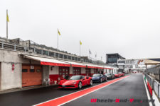 J’aborde donc les premiers tours de roue très humblement, adoptant un rythme très très raisonnable. On a quand même configuré la voiture en mode « Qualify » pour bénéficier de tout le potentiel moteur mais en conservant le manettino sur le mode « Wet », histoire de mettre tous les atouts et surtout les assistances de notre côté. Malgré cela, je constate vite l’excellence du châssis et la précision des trains roulants. La sonorité du V8 est également très sympathique et même avec le casque, je peux parfaitement en profiter. Tour après tour, sans tirer de trajectoires trop tendues et avec les recommandations d’Andrea, j’augmente gentiment la cadence. Je limite également les passages dans les stands, regroupant ainsi les sessions afin de garder les pneumatiques à bonne température. Cela me permet aussi de conserver ma concentration et de bien me rappeler l’état de l’asphalte tout au long du tracé pour appliquer une conduite plus sportive là où le grip est le meilleur.
