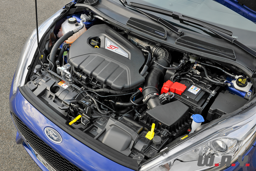 Voici le cœur de la bête. Il s’agit d’un quatre cylindres Ecoboost de 1.6 litre de cylindrée à injection directe et turbo. Développant 182 CV à 5’700 t/min, il offre 240 Nm de couple entre 1’600 et 5’000 t/min. Un overboost porte la puissance à 200 CV et le couple à 290 Nm pendant quelques secondes une fois la pédale d’accélérateur enfoncée avec vigueur. Des valeurs qui propulsent la Fiesta ST à 223 km/h en vitesse de pointe et lui permettent d’abattre le 0-100 km/h en 6.9 secondes. C’est peu dire que Clio R.S. et Fiesta ST se débattent dans un tout petit mouchoir de poche et qu’elles auront une petite place à faire pour leur alter-ego de Sochaux.