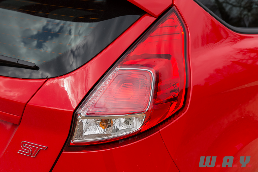 La Fiesta ST fait tout, ou presque, comme sa grande sœur la Focus ST, c’est-à-dire : un kit carrosserie spécifique avec des pare-chocs enveloppants et une énorme calandre en nid d’abeille affublée du logo ST pour l’avant. Le profil, dynamisé par un seul ouvrant (la Fiesta ST n’est disponible qu’en trois portes chez nous, bien qu’une version cinq portes, plus avenante pour les passagers, soit disponible en Amérique du Nord), s’orne à la fois d’une nervure ascendante soulignant la ceinture de caisse et se voit accentué par des mini-jupes proéminentes. Notre petite bombinette se chausse de jantes 17’’ qui laissent entrevoir les étriers de freins peints en rouge. L’arrière se coiffe d’un becquet sur le hayon et abrite en sa partie basse un extracteur et les sorties d’échappement, malheureusement conventionnelles. L’audace affichée sur la Focus ST pour cet appendice reste l’apanage de la grande sœur. L’ensemble ne manque pas de style, affiche clairement ses ambitions sans verser dans le tuning de goût douteux. Ford propose pour sa puce trois coloris exclusifs en option : Rouge Racing, Molten Orange et Bleu Performance. Destinée, comme la Focus ST à conquérir le monde, le consensus stylistique sur la Fiesta ST est à nouveau réussi !
