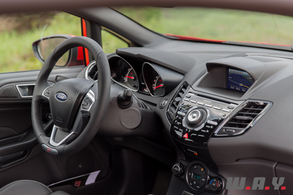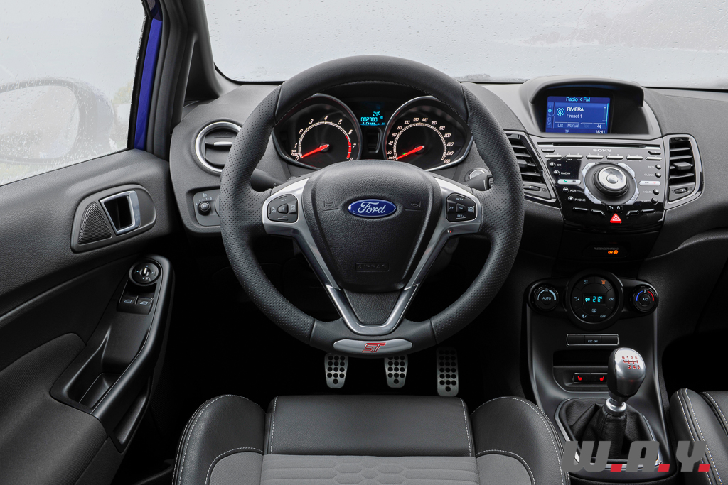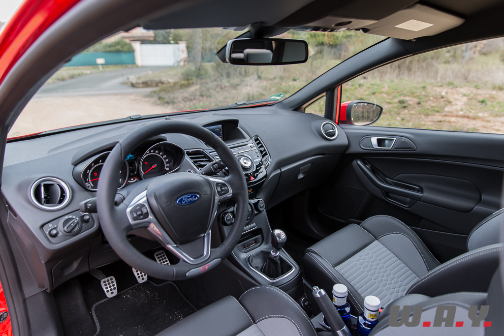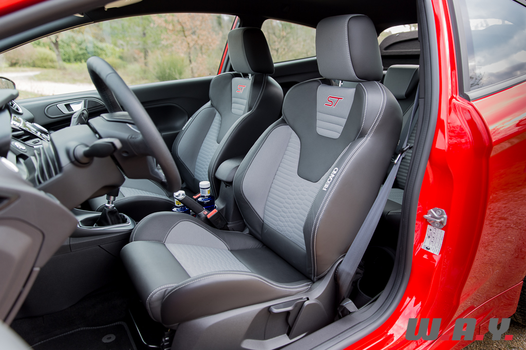 A l’intérieur on est également en terrain connu. La planche de bord est reprise de la gamme Fiesta standard avec l’ensemble des équipements. Pour la sportivité, le constructeur y ajoute les magnifiques sièges baquets « Recaro » mélangeant cuir et tissu, un volant à jante large siglé « ST », un pédalier en aluminium et quelques touches de carbone (en option). L’ensemble respire la qualité perçue, se montre plus valorisant que celui de la Clio R.S., sans être imperfectible pour autant et l’ergonomie reste en certains points hasardeuse notamment en ce qui concerne les commandes et l’utilisation du GPS et de la radio.
