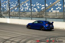 Au bout de la ligne droite des stands, on attaque un gros freinage à plus de 200 km/h, tombant un rapport au passage, pour une cassure à gauche qui descend du banking. Ce freinage est le plus violent du tour, mais même lorsqu’on est debout sur la pédale de frein, l’ABS ne s’affole pas avec les roues bien droites. L’enchainement qui suit passe en 4 avec un peu de courage, droite, gauche, petit bout droit pour tomber la 3 et refaire un droite gauche. Là, en sortie, il faut être propre, débraquer les roues pour mettre plein gaz et aller tutoyer le mur de la ligne droite extérieur. Avec un peu trop de volant, les 320 ch ne passent que difficilement au sol. Au premier essai, le témoin du contrôle de traction me sert de lampe de lecture tellement il s’allume longtemps. Freinage à 150m, celui qui ose peut se jeter sur le gros vibreur pour aller chercher la corde suivante d’une traite. Ce léger droite passe vite, mais la grande épingle gauche qui suit demande qu’on s’applique sur la trajectoire. En léger dévers, elle nous fait sentir le travail de la suspension pour contenir le roulis et le train arrière que j’aurais, pour ma part, aimé plus mobile. Gaz en grand pour le virage le plus rapide en dehors des banking. Le freinage d’entrée de courbe est appuyé mais très court pour arriver avec de l’élan et faire sous-virer la Civic jusqu’à la corde. Si le sous-virage est naturellement présent, la précision nécessaire demande de la pratique. Restent un enchaînement interrompu par une épingle, puis un long gauche qui renvoie sur le faux anneau de vitesse et la pitlane.