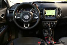 Pour confirmer son appartenance à la famille Jeep, le Compass propose, à gauche du levier de vitesses, un sélecteur rotatif des modes off-road : sable, boue, rocher et neige, ainsi qu’une assistance de descente. Sur la version Trailhawk s’y ajoute le sélecteur de la boite courte et le verrouillage du différentiel inter-ponts. On y trouve aussi le “Jeep skills” qui affiche toute sorte de données sur l’écran dont les angles de pente et les modes de traction. Plutôt qu’une boîte de transfert classique, Jeep propose le “one speed power take off unit” qui s’apparente au croisement entre un différentiel et un embrayage multi-disques et qui présente l’avantage d’un encombrement trois fois moindre. Le rapport final en 4WD Low est de 20:1.