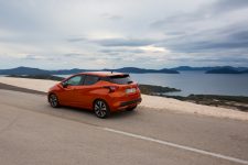 Le look de la nouvelle Micra ressemble en tous points au concept Sway présenté à Genève en 2015. La calandre en V projette ses lignes jusqu’à l’arrière de la carrosserie où les poignées de porte sont dissimulées, créant ainsi un pavillon flottant. Les feux tout en reliefs relèvent le style de la face avant déjà généreusement sculpté tandis que, sur le côté, le bas des portes est renfoncé au lieu de ressortir. Ce trait qui court sur la ceinture de caisse sous le rétroviseur me semble familier, cependant l’effet abaissant pour l’avant de la voiture est visuellement intéressant.