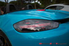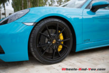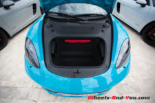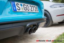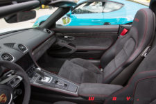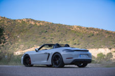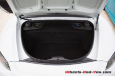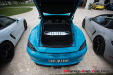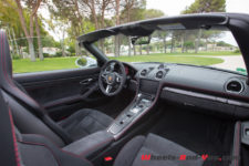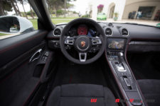 Sans surprise, on trouve un moteur à plat en position centrale arrière, seulement impossible d’en voir ne serait-ce qu’un cache plastique. Autant en Boxster qu’en Cayman, le moteur des 718 joue à cache-cache. Que les Porschistes sensibles regardent ailleurs, ce bloc est un 4 cylindres à plat de 2.5 litres suralimenté. La puissance augmente de 15 ch par rapport aux modèles S, le couple atteint, quant à lui, la valeur de 430 Nm dès 1’900 t/min.