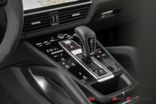 La sportivité est encore plus évidente sur le Coupé avec une largeur aux ailes arrière qui augmente de 18mm. Afin de renforcer le dynamisme du modèle, Porsche a équipé le Cayenne Coupé d’un aileron actif qui se déploie dès 90 km/h, améliorant ainsi l’appui sur le train arrière. Rajoutez à cela le « Lightweight Sports Package », disponible en option, et franchement, une fois au volant, je ne sais plus si je conduis un SUV sportif ou une 911 haute sur pattes. Je reviendrai en détails sur mes impressions de conduite dans un moment. Ce pack comprend entre autres le toit en carbone (-21kg), une finition noire au lieu de chrome pour différents éléments extérieur, mais aussi des sièges habillés de cuir noir et du fameux tissu pied-de-poule gris. Ce package n’est malheureusement pas donné puisqu’il faudra débourser entre CHF 12’860.- et CHF 16’060.- (tarif dépendant du modèle), mais tellement désirable.