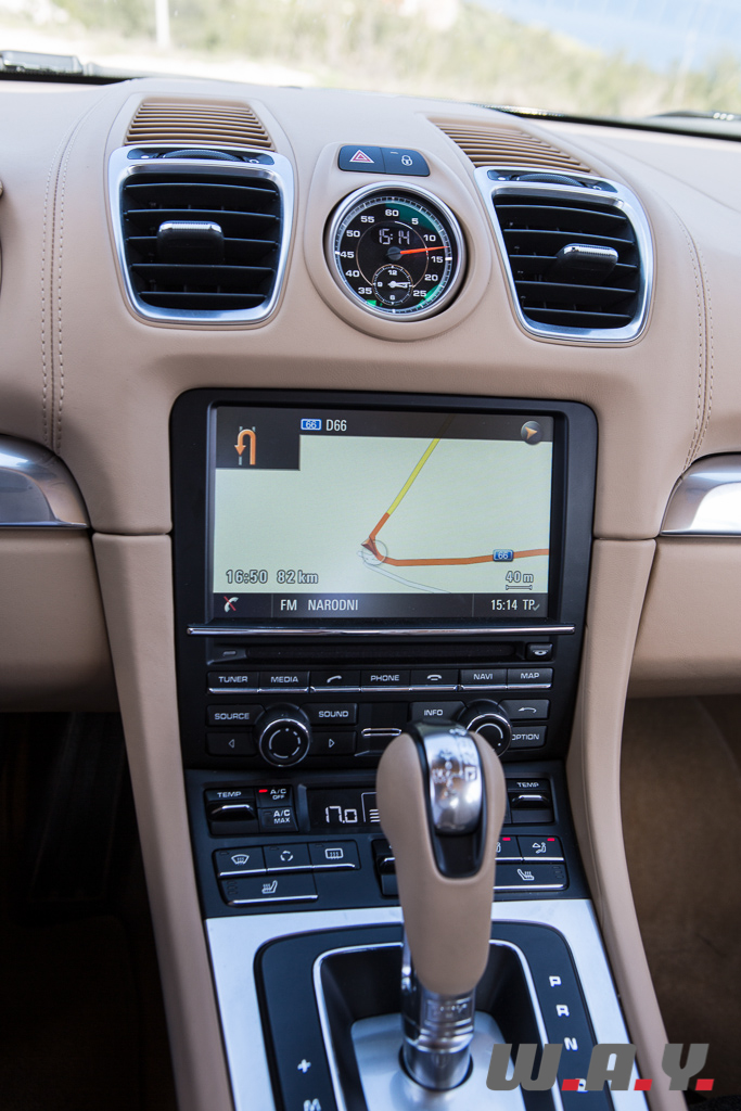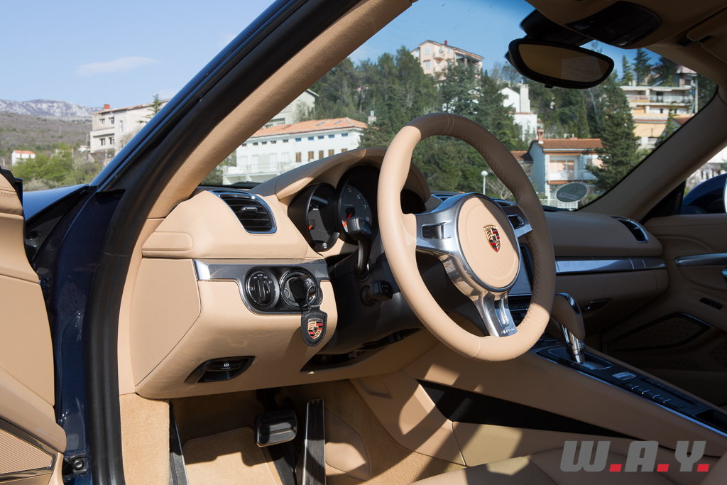 Globalement, à l’exception du toit et de la face avant dessinée différemment sur la partie basse du pare-choc avec ses feux de position, l’ensemble de la ligne est très similaire à la Boxster. Tout ou presque se ressemble et ce n’est pas pour me gêner car à mes yeux, la troisième génération de Boxster bénéficie également d’un excellent coup de crayon. Au-delà de ces lignes fluides, j’apprécie particulièrement des détails comme ce très sage béquet intégré dans le coffre qui se marie à la perfection avec les feux de recul. Toutefois, passé les 120 km/h, l’aileron se détache et redessine l’arrière en lui conférant un côté beaucoup plus agressif. Et les petites jupes sous le pare-choc arrière avec les deux sorties d’échappement chromées ? Je n’ai qu’une envie, entendre leur cri quand le moteur sera à la limite de la zone rouge à 7’400 t/min !