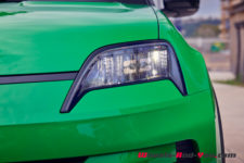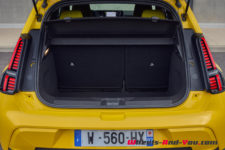 Les phares LED en forme de pupille intègrent le drapeau français qui accentue le « Made in France ». Plus bas, là où se trouvaient les antibrouillards de la R5 Alpine, se dessinent deux rectangles aux coins arrondis intégrant les clignotants. C’est du plus bel effet mais peut-être un peu vulnérable lors des stationnements en ville. Sur le capot, la prise d’air est devenue un indicateur de charge à cinq bâtons LED qui s’éteignent au fur et mesure de la consommation. Les grandes roues de 18 pouces, affleurantes à la carrosserie, sont repoussées aux quatre coins de la voiture qui ne dépasse pas 3.92 mètres.