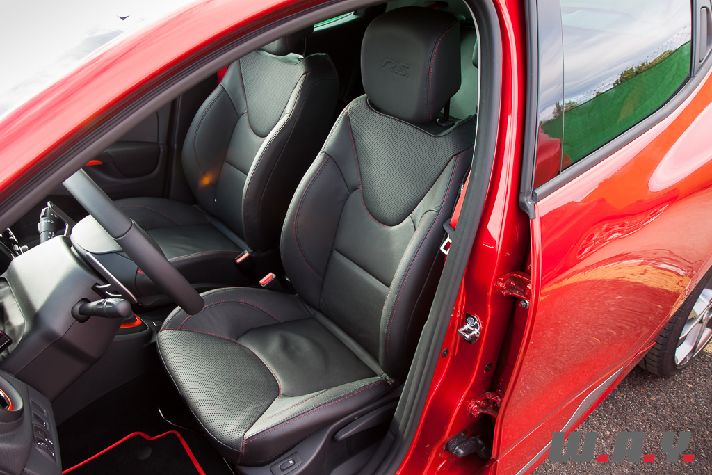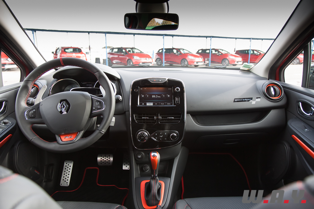 A l’intérieur, les choix sont plus conventionnels. Du plastique dur et un peu “cheap”, du cuir optionnel pour les sièges baquets (tiens, les Recaro ont disparu du catalogue ?), le noir domine l’habitacle. Seules quelques petites touches de rouge par-ci par-là permettent d’identifier la race sportive à laquelle notre Clio appartient. La qualité des matériaux et la finition se situent dans la moyenne de la catégorie, sans pour autant être extraordinaires et proposent des textures originales. Par contre là où la petite fait le plein, ce sont les équipements. Tout ce qui est habituel au confort d’aujourd’hui est présent de série, même l’interface GPS ou le système de démarrage sans clé.