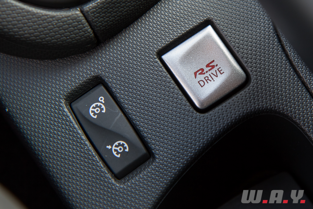 Polyvalence est le maître mot. Car en fait, en signant un bon de commande pour une Clio R.S., vous vous apprêtez à acheter trois autos en une. Je m’explique : en série, la Clio R.S. est équipée du « R.S. Drive », à savoir un bouton qui permet de choisir parmi trois modes de conduite selon votre humeur, « Normal », « Sport » ou « Race ». Chacun de ces trois programmes agit de manière différentiée sur une kyrielle de paramètres tels que le ralenti moteur, la progressivité de la pédale d’accélérateur tant à l’accélération qu’au lever de pied, la sonorité de l’échappement, la direction, le seuil de déclenchement des béquilles électroniques et bien entendu, last but not least, le temps de passage des rapports de boîte. Le freinage est assuré par des disques de 320 mm à l’avant, mordus que par des étriers mono piston mais surdimensionnés, qui se montrent parfaitement à la hauteur de leur mission tant sur route que sur circuit.