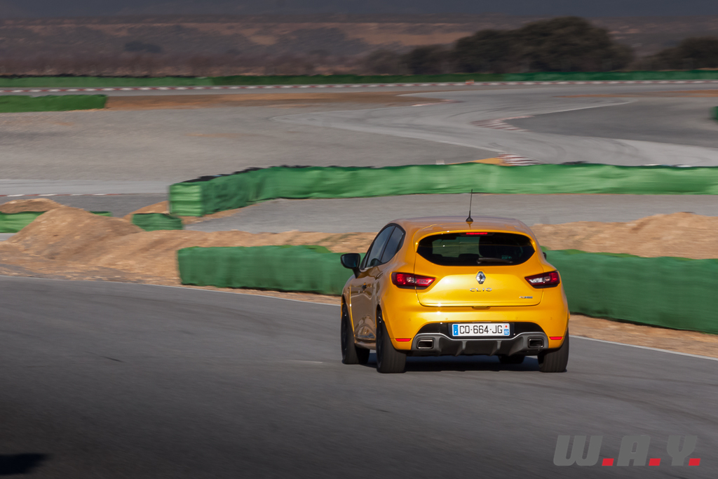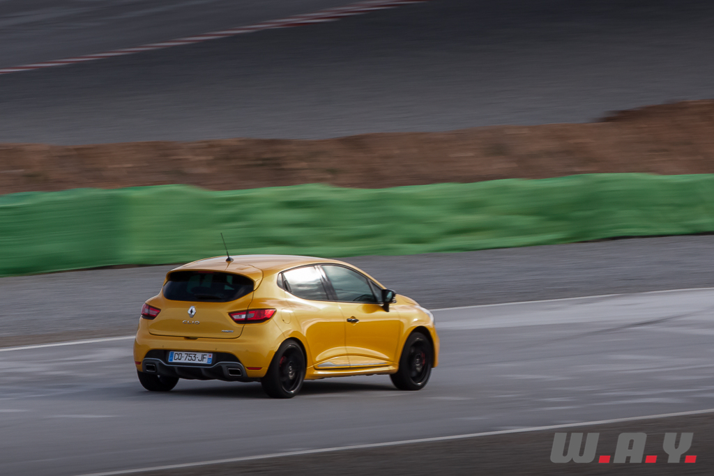 Enfin, le mode « Race » rend inactives toutes les aides électroniques et vous permet d’exploiter tout le potentiel du châssis. Mais à réserver pour une utilisation sur circuit tant la petite française sait se montrer joueuse au lever de pied ou lors de freinages très appuyés, par exemple… La boîte de vitesses est également transfigurée dans ce mode avec des passages de rapports éclairs (< 150 ms), pas de changement de rapport imposé si on tape le rupteur, bref, le pilote a la mainmise totale sur son engin. Mais il ne faudra pas oublier que la Clio reste avant tout une auto de route, toute sportive soit-elle, et pêchera aux limites sur circuit avec, à mon goût, des suspensions un poil trop souples et une direction au final avare en informations sur le grip dans cet exercice.