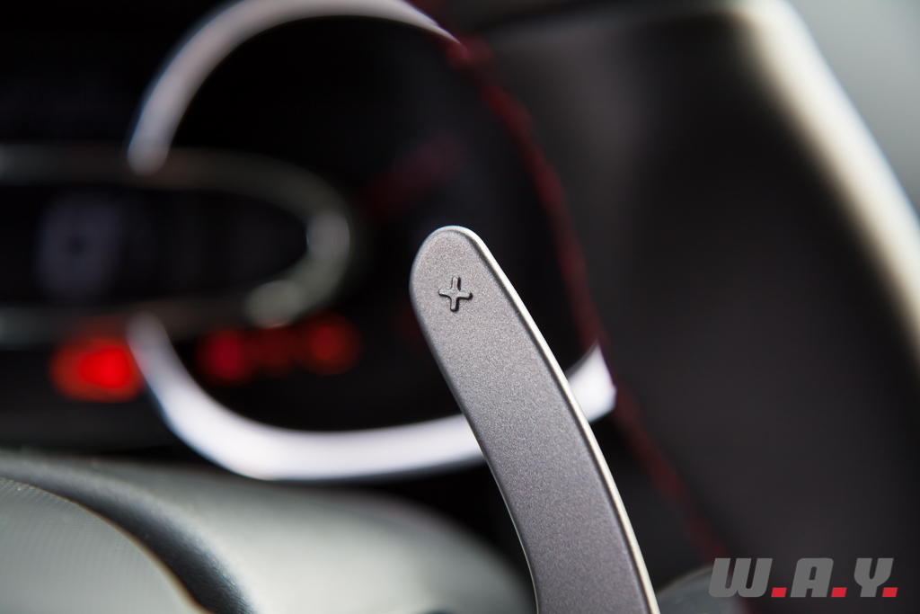 Première pression sur le « R.S. Drive », je passe en mode « Sport ». Les principales différences relevées proviennent de la réactivité de l’accélérateur avec une montée en régime plus franche du moteur et la direction devient plus ferme. La soi-disant rapidité augmentée des passages de rapports ne m’a pas paru flagrante si ce n’est l’apparition dans ce mode d’un exaspérant « Bip » à l’approche du rupteur. Et si vous tardez à appuyer sur la palette, la boîte se chargera de passer le rapport supérieur pour vous. Énervant. Par contre, c’est dans ce mode que le différentiel « R.S. Diff » démontre toute son efficacité dans une conduite sportive. La progressivité du système rend l’action imperceptible et la différence entre le « R.S. Diff » et un différentiel mécanique est devenue extrêmement ténue.