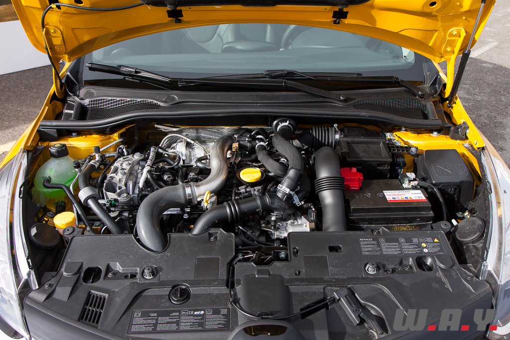 La nouvelle Clio R.S. a elle aussi succombé à la mode du downsizing. Exit donc le bon vieux 2.0 litres atmosphérique et place à un 1.6 litres turbocompressé vigoureux et à la plage d’utilisation plus large que son prédécesseur. Développant 200 CV à 6’000 t/min et un couple maxi de 240 Nm dès 1’750 t/min (contre 210 Nm à 5’400 t/min pour le 2.0 l.), il se montre d’une souplesse exemplaire à bas régimes tout en offrant une belle allonge jusque vers 6’000 t/min. Le 0 à 100 km/h est abattu en 6.7 secondes et la vitesse maxi annoncée culmine à 230 km/h.