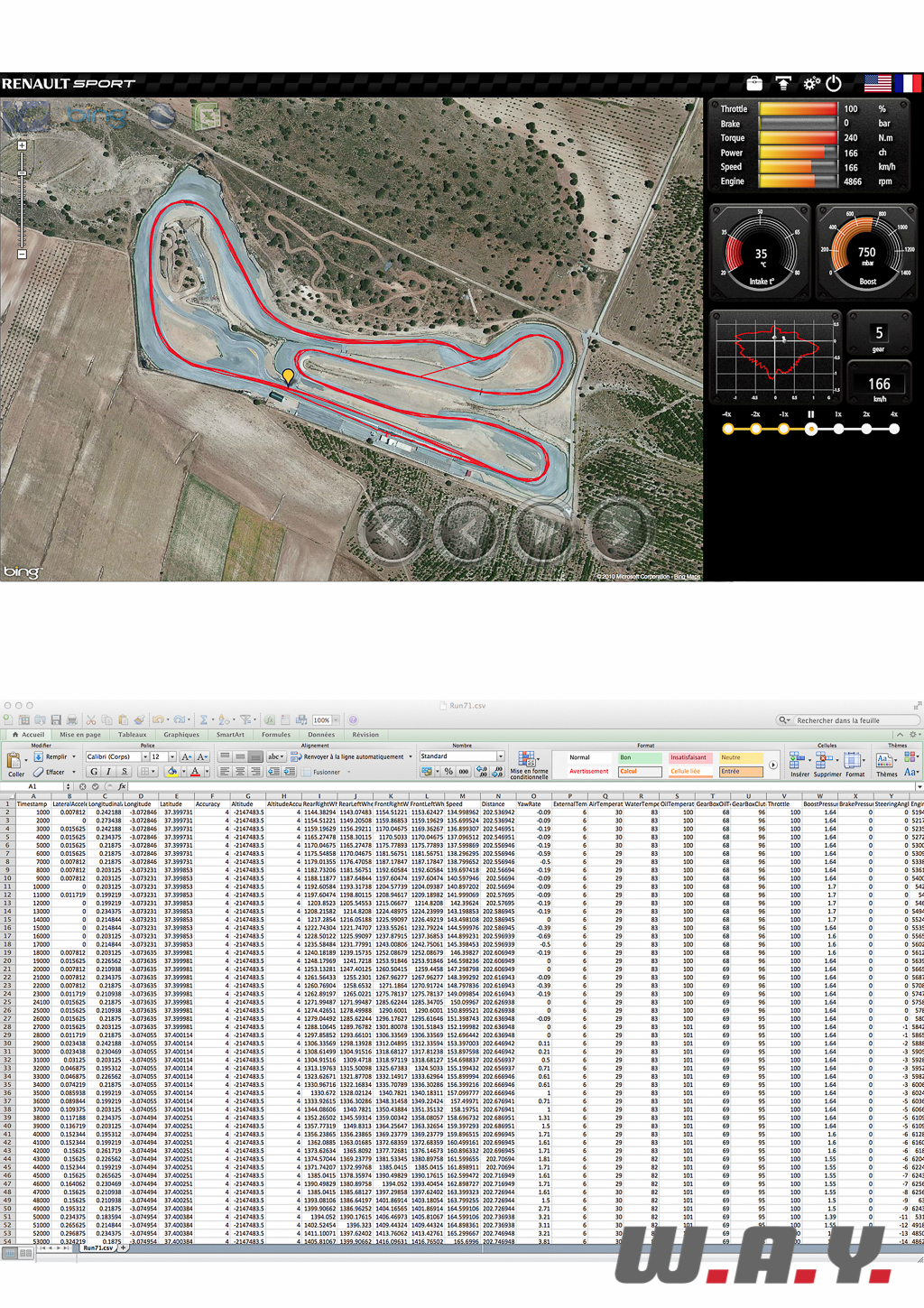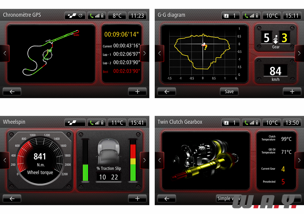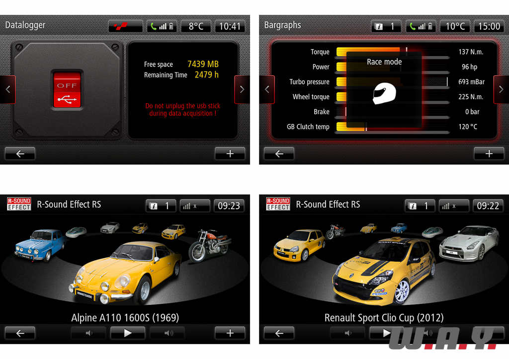 Du côté des gadgets, on notera la présence d’un « Launch Control » très efficace, mais dont l’utilité reste à m’être démontrée une fois la galerie épatée sur un parking de centre commercial désert. Le logiciel de télémétrie embarquée « R.S. Monitor », dans sa version 2.0, prend incontestablement de l’envergure avec un nombre de menus et de paramètres n’ayant rien à envier à la Formule 1. Il est possible également d’enregistrer les données d’une session circuit sur une clé USB et exporter tous ces chiffres soit dans un tableur Excel si vous êtes ingénieur pour interpréter tout ça ou alors sur un site web dédié à partir duquel il vous sera possible de modéliser votre conduite sur le tracé du circuit en observant tous les paramètres. Enfin, le système multimédia « R-Link » propose entre autres aux geeks la possibilité d’apporter de l’ambiance à leur conduite en reproduisant le son moteur d’illustres modèles Renault (Clio V6, Clio Cup, Alpine 1600, Nissan GT-R [!], etc.) en fonction de sa conduite, au travers des haut-parleurs. Si techniquement le système est convainquant par son rendu, je l’ai trouvé pour ma part ludique sur quelques kilomètres seulement…