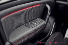 A l’intérieur, peu de détails distinguent la R.S. des autres Mégane. Des inserts à l’apparence carbone dans la planche de bord et dans les contre-portes, des surpiqûres et un intérieur garni de cuir Alcantara en option. Sur le volant, il y en a en-haut et en-bas, mais pas là où on pose instinctivement les mains. Un volant tout Alcantara, bien que plus fragile, aurait été encore plus agréable en main que ce cuir micro-perforé. Mon regard est accroché par les plastiques inférieurs, durs et brillants. Leur aspect me donne une impression de qualité inférieure comparé à une version 3, surtout que les surfaces sont importantes.