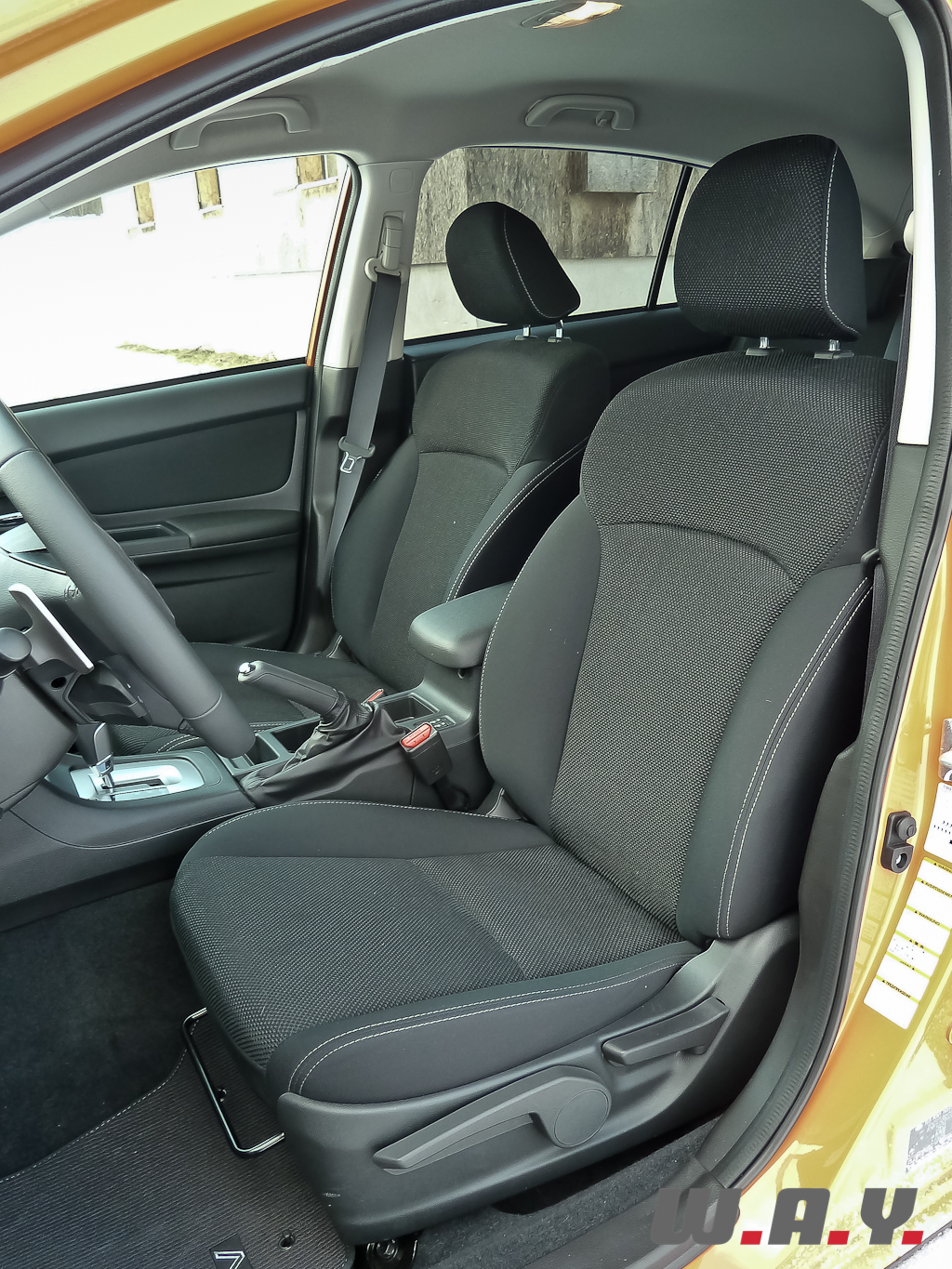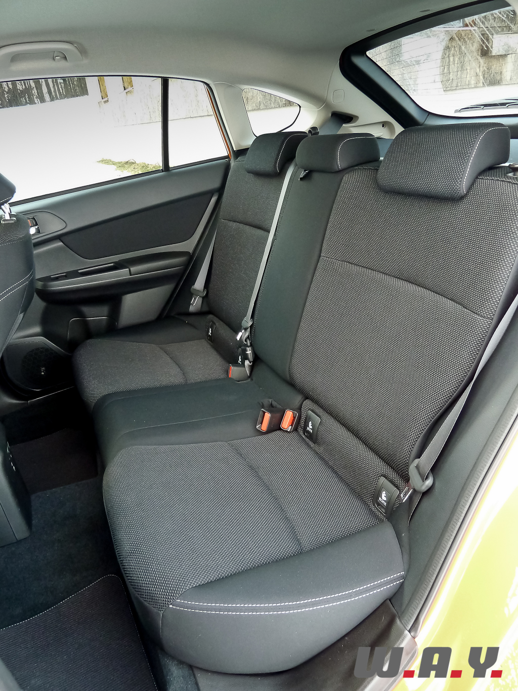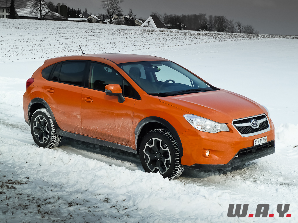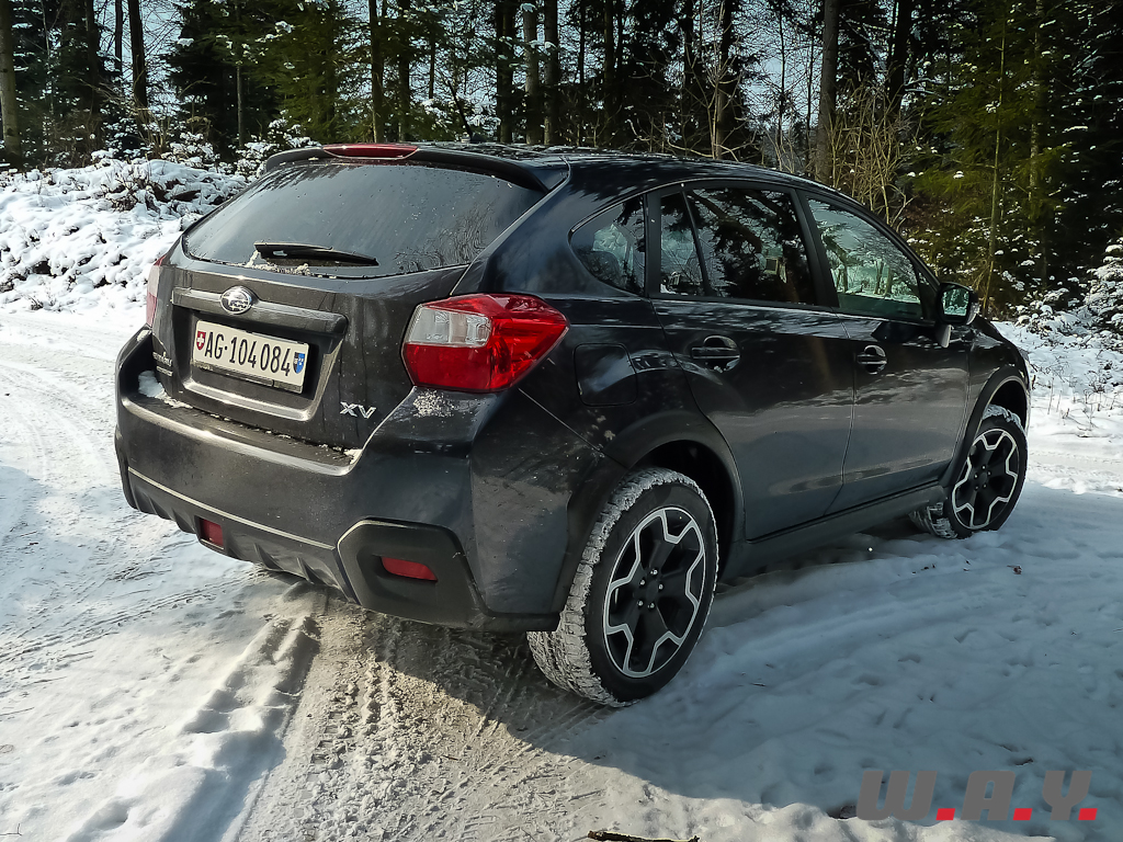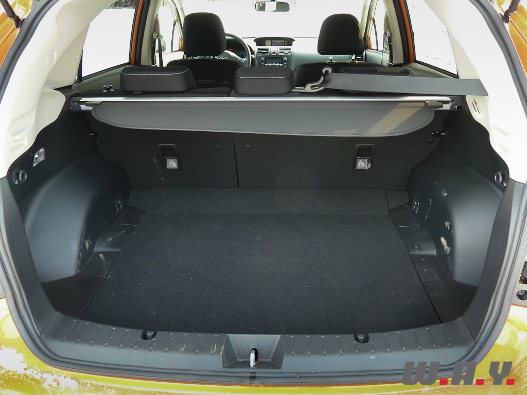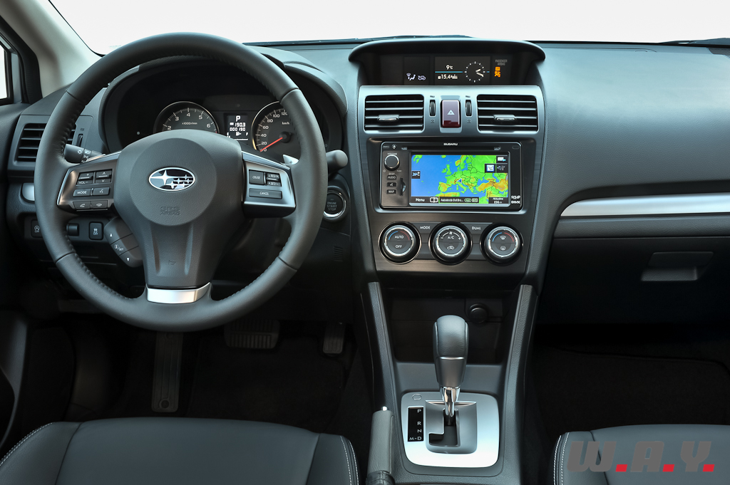 Dévoilée en nouveauté mondiale en septembre 2011 à l’occasion du dernier Salon de Francfort, la Subaru XV n’est pas une révolution stylistique. La base est similaire à la nouvelle Impreza, une berline cinq portes compacte, et les évolutions par rapport à la version précédente sont des lignes plus tendues résultant d’une forme globale plus sculpturale. Les pare-chocs sont plus imposants, et la différence majeure se trouve dans les optiques avant et arrière dont le dessin s’apparente à ceux de l’actuelle Legacy. La forme de la calandre s’inspire aussi de cette dernière apportant à l’ensemble une unité familiale plus évidente entre les deux modèles. L’œil averti retrouvera rapidement quelques similitudes avec l’Impreza Concept, présentée à Genève en 2011, sous la forme d’une berline tri-corps. Pour revenir à la XV, comme expliqué précédemment, la garde au sol est passée à 22 cm, soit 7.5 cm de plus qu’une Impreza. Le bouclier avant est souligné par une partie inférieure en plastique noir. Cet attribut esthétique se retrouve sur les passages de roues, les bas de caisse et les extrémités inférieures du pare-choc arrière confortant l’apparence « offroad light » de la Subaru XV. Un diffuseur rainuré, peint couleur carrosserie et des jantes 17″ avec une partie centrale noire, spécifiques à la XV, complètent le tableau. A l’occasion de cet essai, nous avons pu découvrir plusieurs coloris dont la robe orange déjà découverte lors de la présentation à Francfort. L’intérieur est un peu plus austère, voire triste, totalement dans l’esprit des autres productions de la marque. Les plastiques sont de bonne facture, la finition est correcte comme à son habitude dans les standards japonais. Si tout semble plutôt simple, l’équipement de base, appelé « Swiss One », est quand à lui très complet, composé entre autres d’une climatisation automatique et de multiples airbags. En sus, deux packages d’options sont proposés, « Swiss Two » et « Swiss Three », avec par exemple un régulateur de vitesse, une climatisation à deux zones, des phares et essuie-glaces automatiques, des projecteurs xénon, un intérieur cuir, un toit ouvrant électrique, un système keyless, etc. Les trois finitions disposent d’un système « Infotainment » spécifique à chaque niveau, un combiné audio et informations regorgeant de possibilités pour informer le conducteur et ses passagers. De base il s’agit d’un lecteur radio/CD avec écran déporté sur la partie supérieure du tableau de bord et, suivant le modèle, il s’agrémente d’une caméra de recul, d’un lecteur MP3, du Bluetooth, d’un GPS, etc. L’espace à bord est très agréable, l’impression de grandeur confirme la possibilité d’accueillir facilement cinq adultes. Le coffre aussi propose un volume correct de 380 litres, pouvant atteindre 1’270 litres en rabattant la banquette arrière tout en profitant d’un plancher totalement plat.