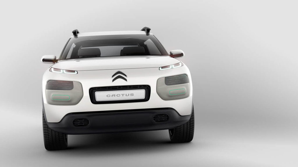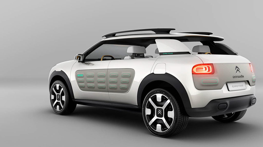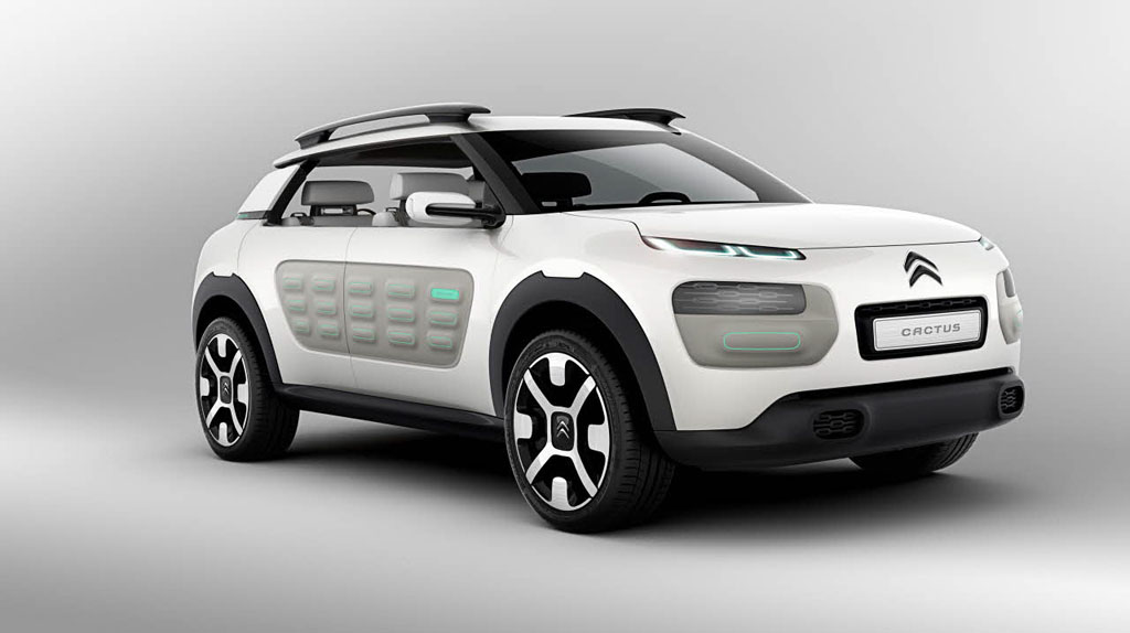 Le Citroën Cactus se veut l’ambassadeur des futurs modèles de la gamme C du constructeur français. Il simplifie l’automobile en éliminant le superflu et met en avant le bien-être. Esthétiquement l’ensemble est très simple, surtout dans cette teinte blanche, tout en rondeurs. Il intègre des éléments de carrosserie personnalisables appelés “Airbumps” dont la matière contient des capsules d’air pour protéger la carrosserie.