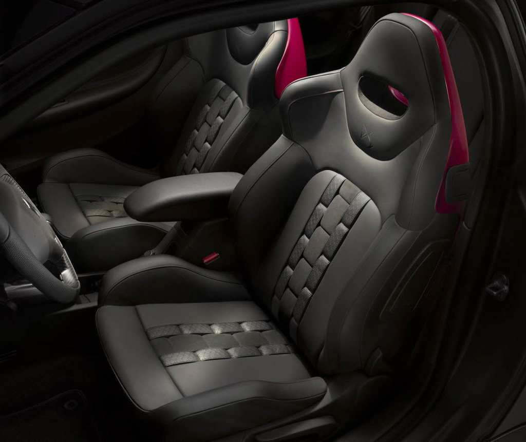 Pour l’occasion, le concept car DS3 Cabrio Racing arbore une teinte “Gris Moondark” à la finition mat texturé, des jantes 19″ noires brillantes et des inserts “Black Chrome” sur les poignées, l’enjoliveur de coffre et les rétroviseurs, des éléments habituellement chromés sur la DS3 Cabrio normale. Le toit est habillé d’une toile noire avec la trame DS en fil brillant dont l’apparence s’inspire du tissage de la fibre de carbone. Finalement on retrouve quelques touches peintes en rouge Carmin pour accentuer le côté Racing de la voiture.