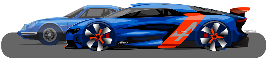 Alors que le dessin s’inspire du concept car Renault DEZIR, les lignes et la teinte “bleu Alpine” sont clairement dérivées de la mythique berlinette présentée en 1962 au Salon de Paris. Cette Renault Alpine A110-50 est basée sur la Mégane Trophy dont elle reprend le châssis tubulaire et le moteur central arrière, un V6 3.5 de 400 CV. Ce dernier est couplé à une boîte séquentielle six rapports comme sur la voiture de course. Simple étude de style ou réel projet de faire revivre la marque Alpine, nous n’en savons rien pour le moment, mais nous pouvons qu’espérer que le rêve devienne réalité.