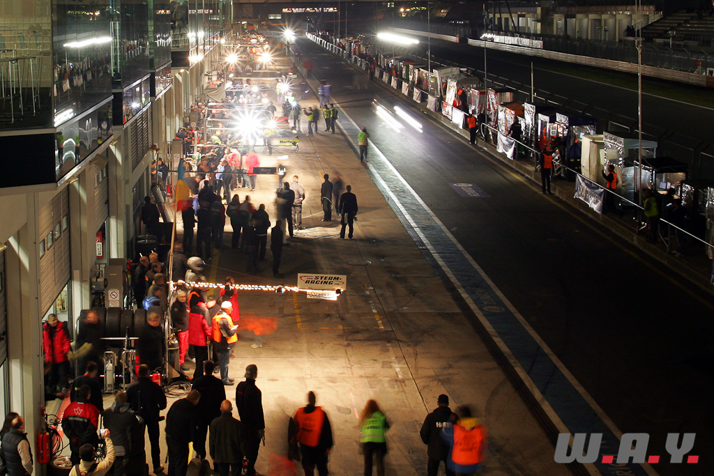 Moins de dix minutes plus tard, les concurrents ont déjà bouclé leur première ronde de vingt-cinq kilomètres…. Très vite retentit la fameuse sirène stridente annonçant les premières voitures dans la voie des stands. Le nombre de voitures engagées est si important que même les grandes équipes doivent partager leurs stands. Après moins d’une heure de course la valse des ravitaillements bat son plein… elle ne se terminera qu’une fois le drapeau à damier franchi. Ça fourmille, ça hurle, c’est le désordre le plus total, mais lorsqu’une voiture approche, tout semble s’organiser comme par magie, chacun exécutant sa partition sans la moindre fausse note, avec un seul objectif : reprendre la piste le plus rapidement possible.