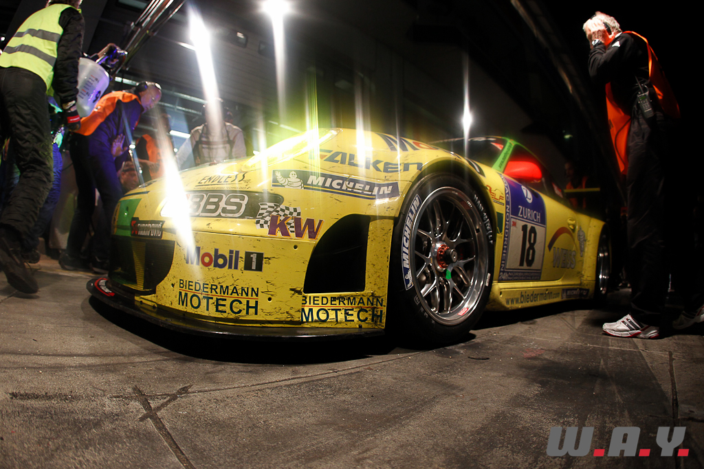 La nuit est maintenant tombée depuis longtemps, il y a moins de monde dans les stands, mais les arrêts sont toujours aussi fréquents… les pilotes se relaient au volant. A chaque arrêt c’est plus ou moins le même scénario, changement de gommes, nettoyage du pare-brise et des phares, et pendant que le réservoir finit de se remplir d’essence, petits ajustements des phares, du moteur, d’un élément aéro ou même un petit coup de marteau pour redresser la carrosserie.