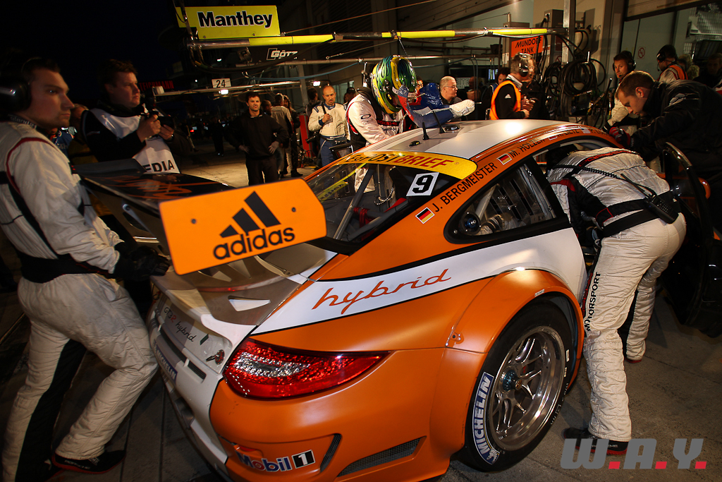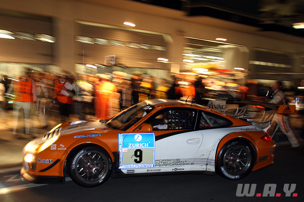 Scène pour le moins insolite, une sublime Mercedes SLS, avec son ronflement caractéristique, remonte l’allée des stands. Elle est précédée par une Opel Manta 400, une queue de renard accrochée à l’antenne ! Cote de sympathie maximum pour la Manta qui est pilotée par un ex-directeur compétition d’Opel. C’est aussi ça les 24h du Nürburgring !